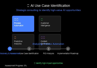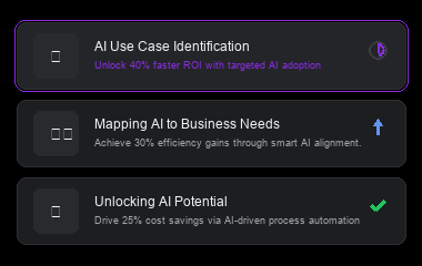 Find the Right AI Use Cases We begin by understanding your business processes, challenges, and goals. Our experts work with your team to identify high-impact AI use cases tailored to your industry. The focus is always on practical, immediate opportunities where AI can save time, cut costs, and unlock new efficiencies—so you don’t waste time experimenting with irrelevant ideas.